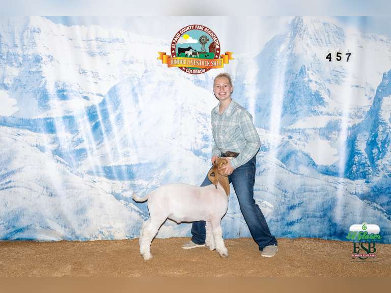 Hello! My name is Cecily Paas; this is my second year in 4-H, and my first year in the market goat project. Meet my Market Goat, Butterscotch, a Boer Wether. I obtained Butterscotch from a breeder in Fort Collins, CO in March of this year when he weighed 35 lbs. Whenever I walk into the barn, the goats are always curious to see if it is feeding time. Butterscotch has a healthy appetite, and over the course of the past 14 weeks has gained an average of 2.85 pounds/week, for a total weight gain of 40 pounds. Butterscotch was slow to warm up to me at first, but after many hours of sitting with him and training him, he has warmed up to me and now comes to greet me as I enter the barn. Butterscotch was fairly obstinate and did not want to wear his halter for quite some time; however, I continued my training with him, and at times, used a forceful hand to train him. Butterscotch learned his place beside me, and is now very well behaved. Since the day I brought him home, Butterscotch and I have had a very special bond. He is calm, quiet and fluffy!